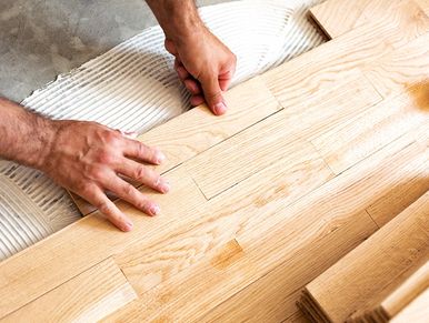 Laying down wood flooring planks or strips onto a subfloor using adhesive, nails, or a floating system.