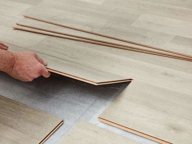 Assembling interlocking planks or tiles onto a subfloor using a click-lock or glue-down method.